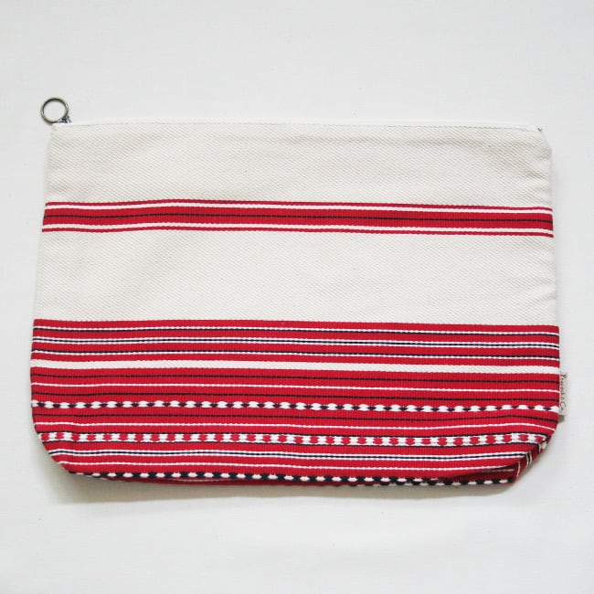 クラッチバッグとして持っても素敵な、A4サイズがちょうど入る大きさの手織りのトラベルポーチ。大きくて丈夫、裏地と内ポケットもついていて、ごちゃごちゃになりがちなスーツケースの中身の必須品もスッキリ整理できます。さらにコットン100%と柔らかい手触りで軽いのも特長です。