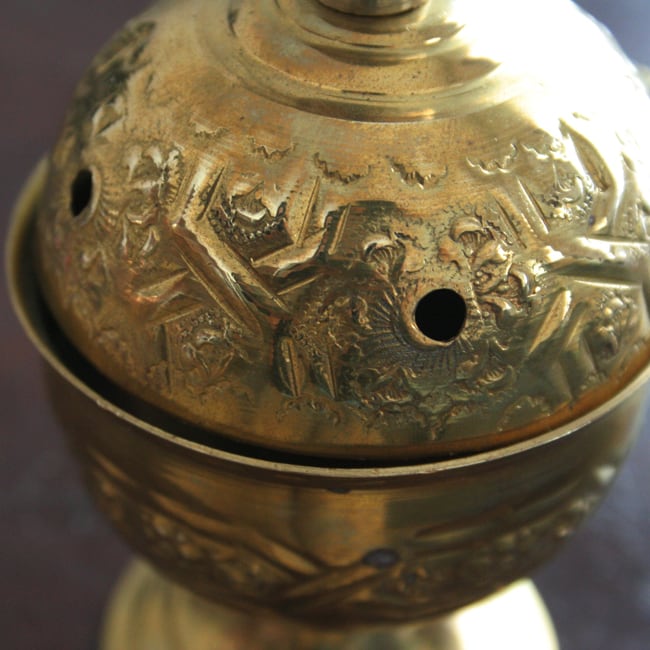 アンティークの真鍮お香立て。精巧な装飾模様はが美しくインテリアとして置いておくだけでも魅力的です。蓋を開けると灰を簡単に取り除けるよう取手のついたお皿が。